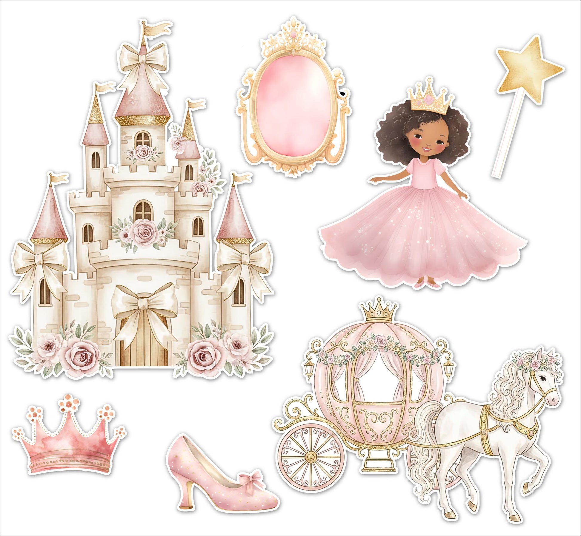 Pink Princess Theme, UV Printed, Acrylic Cake Charm Set. Suitable for many uses not just cakes!