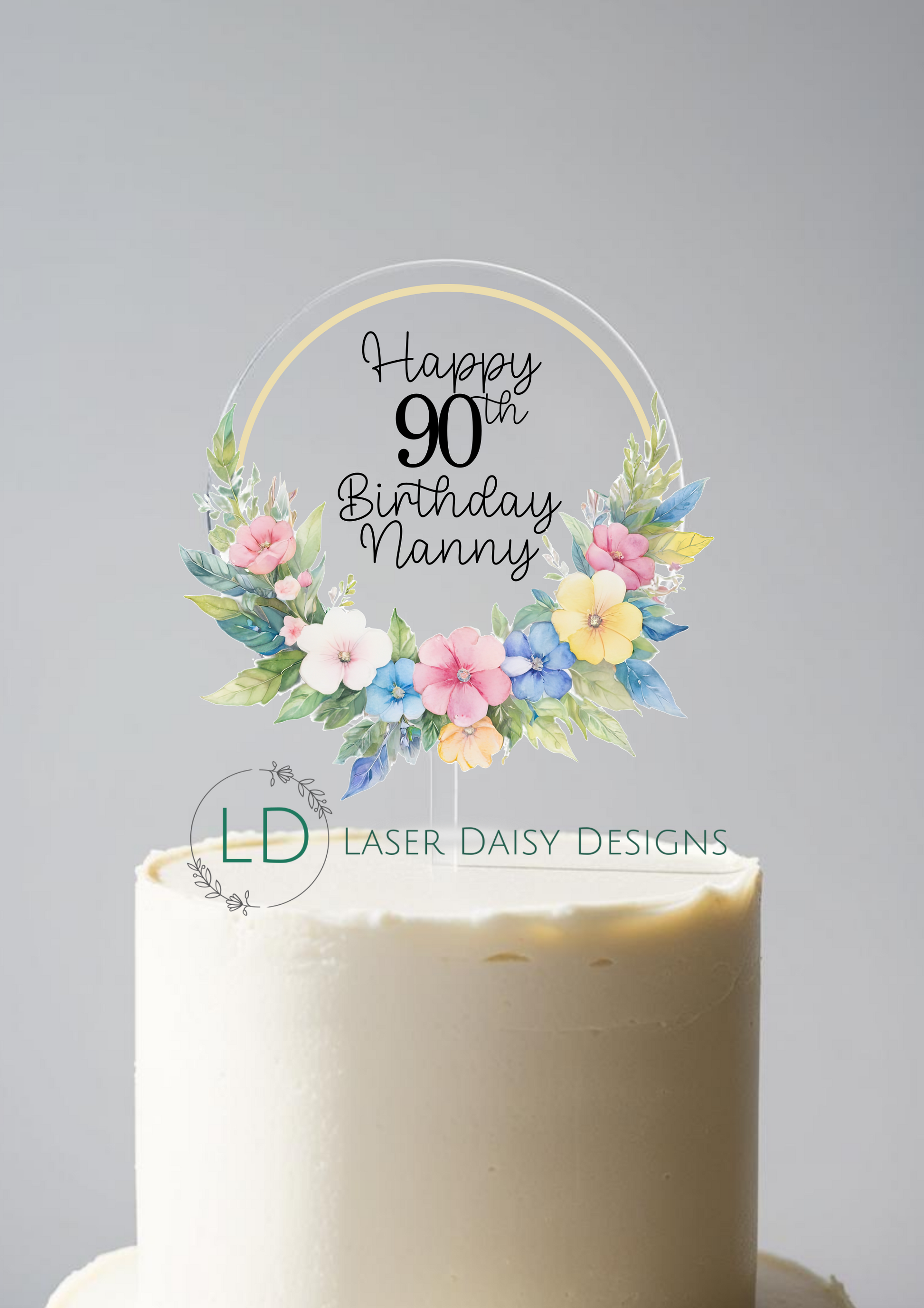 Printed Floral Wreath Acrylic Birthday Cake Topper. Personalised. Non edible